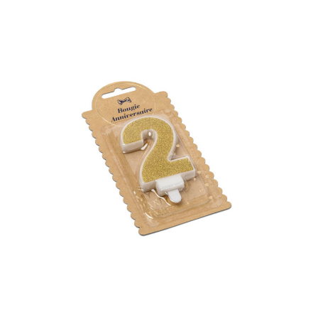 Bougie d’anniversaire en forme de chiffre 2 avec finition pailletée dorée. Parfaite pour décorer un gâteau et célébrer un anniversaire ou une date spéciale.
