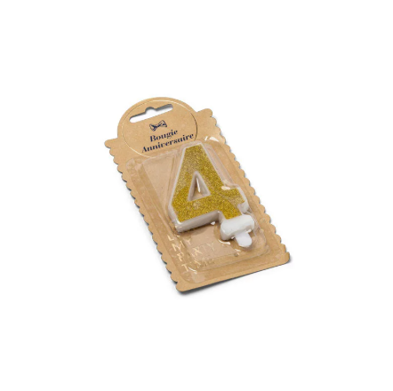 Bougie d’anniversaire en forme de chiffre 4 avec finition pailletée dorée, parfaite pour décorer un gâteau lors d’une fête d’anniversaire.