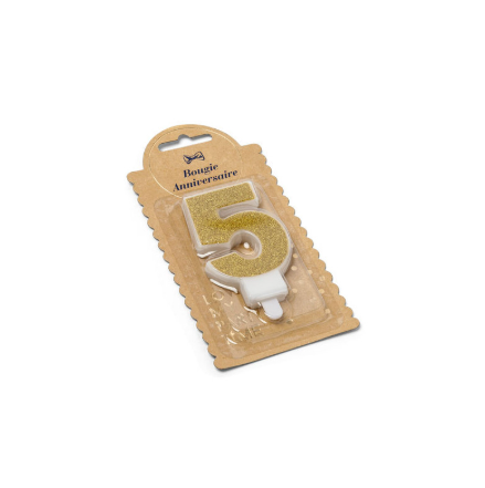 Bougie d’anniversaire en forme de chiffre 5 avec finition pailletée dorée, idéale pour célébrer un anniversaire avec élégance.