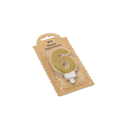 Bougie d’anniversaire en forme de chiffre 6 avec finition pailletée dorée, parfaite pour compléter la décoration d’un gâteau.