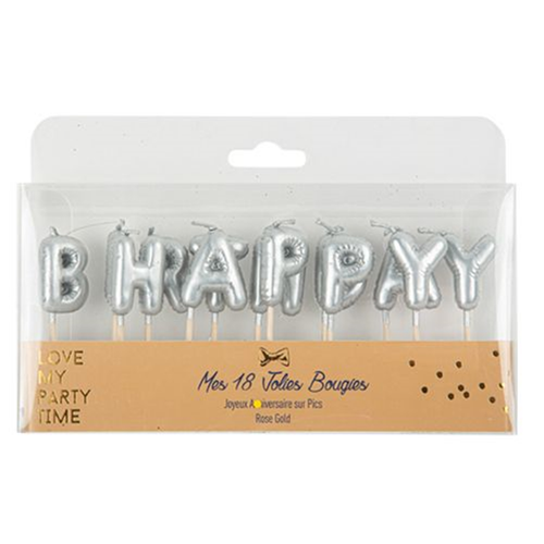 Lot de 18 bougies « Joyeux Anniversaire » avec finition métallisée argent, parfaites pour décorer et sublimer un gâteau d’anniversaire. Élégantes et festives, ces bougies apportent une touche chic et lumineuse à votre célébration. Grâce à leur pic pratique, elles se placent facilement sur le gâteau pour un effet décoratif réussi.