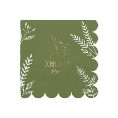 Lot de 10 serviettes en papier aux couleurs élégantes vert sauge et or, idéales pour accompagner la décoration d’une communion. Leur design raffiné apporte une touche douce et festive à votre table et s’harmonise parfaitement avec une décoration de fête élégante.